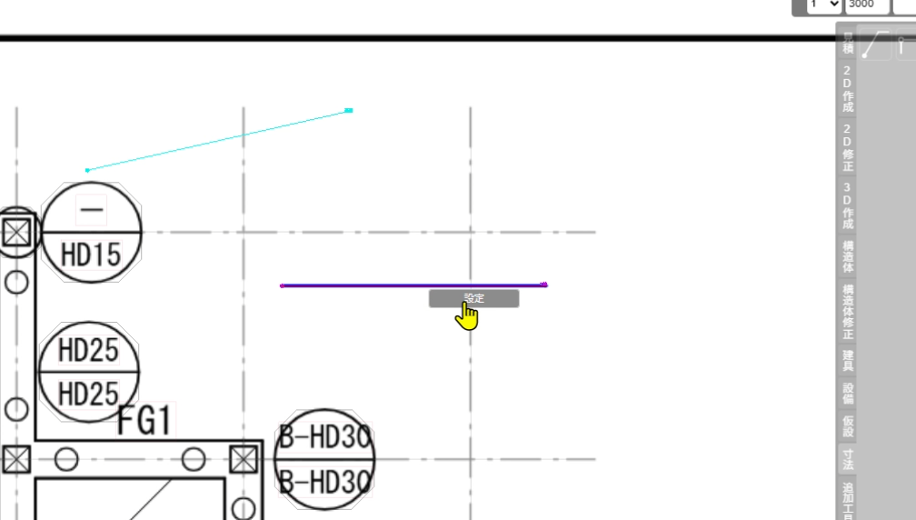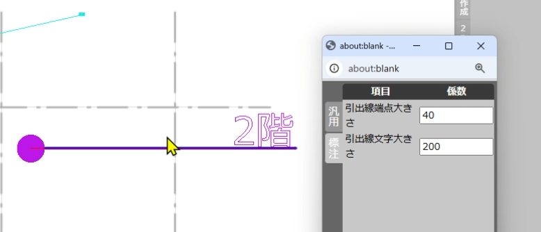 - 図面で書き込みたい箇所に対してマウス左クリック、その後、線を引き出して付箋内容を書きたい位置でマウス左クリック