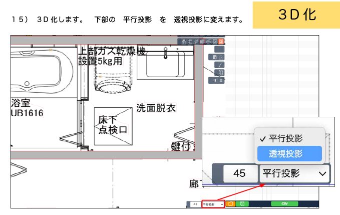 1. 画面下の「平行投影」を「透視投影」に変更