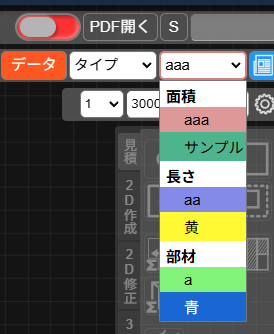 PDF積算GC⇒歯車アイコンの「設定」⇒面積・長さ・部材それぞれで「名称」と「色」を設定⇒PDF積算で使用可能になります。